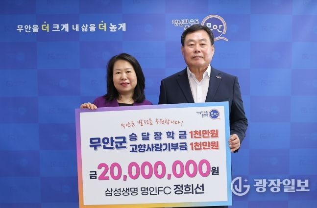 광장일보 주재영 기자 | 전남 무안군은 1일 삼성생명 정희선 명인FC가 지역 인재 양성과 지역 발전을 위해 소중히 써달라며 승달장학금 및 고향사랑기부금 각 1천만 원, 총 2천만 원을 기탁했다고 밝혔다.