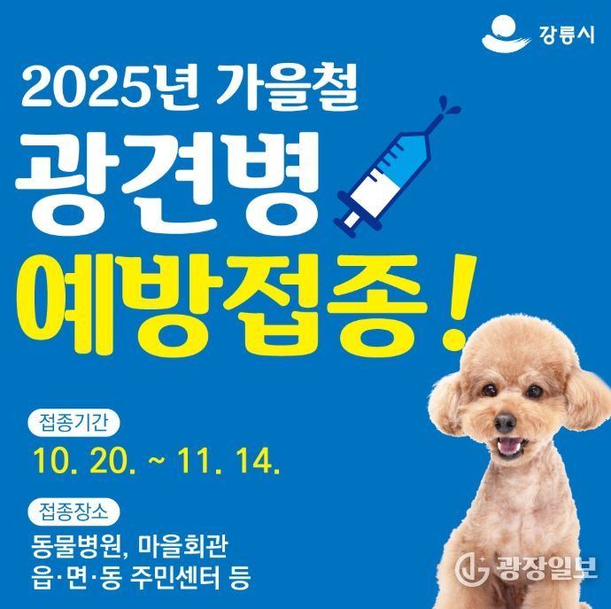 광장일보 이현나 기자 | 강릉시는 인수공통전염병으로 알려진 광견병으로부터 시민과 반려동물을 안전하게 보호하기 위해 오는 10월 20일부터 11월 14일까지 4주간 가을철 광견병 예방접종을 실시한다.
