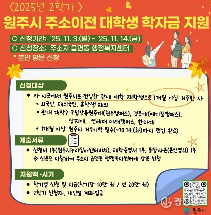 광장일보 이현나 기자 | 원주시는 전입신고를 마치고 원주시민이 된 관내 대학생에게 상·하반기 각 10만 원씩 연 20만 원의 학자금을 지원하고 있다.