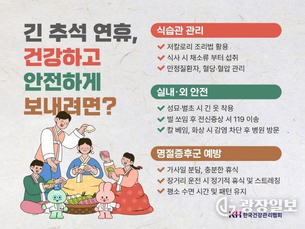 KH한국건강관리협회 인천지부 홍은희원장은 "긴 연휴에는 평소와 다른 식습관과 생활 리듬이 깨지기 쉬운 환경 때문에 오히려 건강 관리에 적신호가 켜질 수 있다”라며 “특히, 이번 연휴는 기간이 긴 만큼 만성질환자들은 평소의 식습관과 약 복용을 철저히 유지하는 것이 매우 중요하다”라고 당부했다.