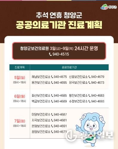 광장일보 주재영 기자 | 청양군보건의료원은 추석 명절 연휴인 3일부터 9일까지 7일간 응급 및 일반 환자의 진료 공백을 최소화하기 위해 응급진료 상황실을 운영한다고 밝혔다.