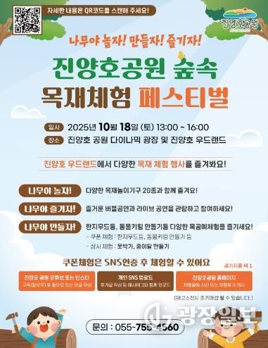 광장일보 주재영 기자 | 진주시는 오는 10월 18일 오후 1시부터 4시까지 진양호공원 다이나믹 광장과 진양호우드랜드 일원에서 『나무야 놀자! 만들자! 즐기자! 진양호 공원 숲속 목재체험 페스티벌』을 개최한다.