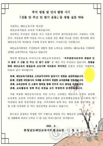 광장일보 주재영 기자 | 충청남도태안교육지원청은 추석 연휴 시기를 맞아 청렴한 공직문화를 확산하기 위해 ‘선물 안 주고 안 받기 운동’을 강조하는 청렴 서한문을 홈페이지에 게시했다.