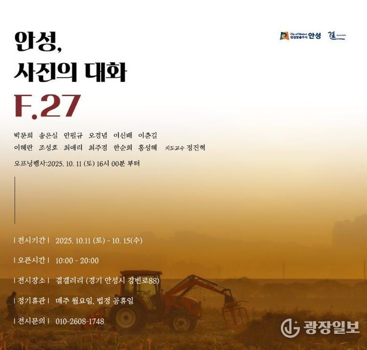 광장일보 주재영 기자 | 안성시 사진동아리 F.27 photo가 오는 10월 11일부터 15일까지 안성천 작은미술관 결갤러리에서 전시회 ‘안성, 사진의 대화 F.27’을 개최한다. 이번 전시는 동아리 회원 18명이 참여해 안성의 자연환경과 사람들의 이야기를 기록한 작품을 선보인다.