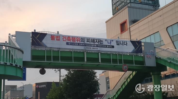 광장일보 주재영 기자 | 영광군은 위반건축물 근절을 위해 유동 인구가 많은 장소에 ‘위반건축물 예방 현수막’을 설치하고 카드뉴스를 배포하는 등 적극적인 홍보활동을 펼치고 있다고 1일 밝혔다.