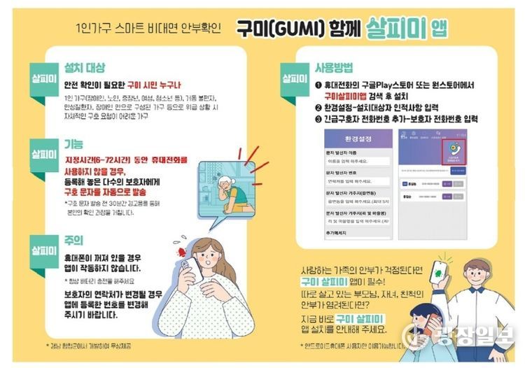 광장일보 주재영 기자 | 구미시는 긴 추석 연휴를 맞아 시민과 방문객이 함께 참여하는 안전망 강화 홍보에 나선다. 특히, 1인 가구, 독거노인 등 돌봄이 필요한 가족과 이웃 등의 안전을 확인할 수 있는 '구미함께 살피미 앱'을 적극 홍보하며 따뜻하고 안전한 명절 만들기에 힘쓸 계획이다.