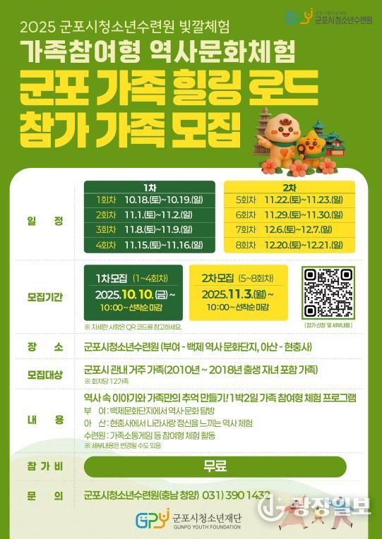 광장일보 주재영 기자 | 군포시청소년재단이 운영하는 군포시청소년수련원(충남 청양)은 관내 가족을 대상으로 2025년 가족참여형 역사문화탐방 '군포가족 힐링로드' 참가자를 모집한다.