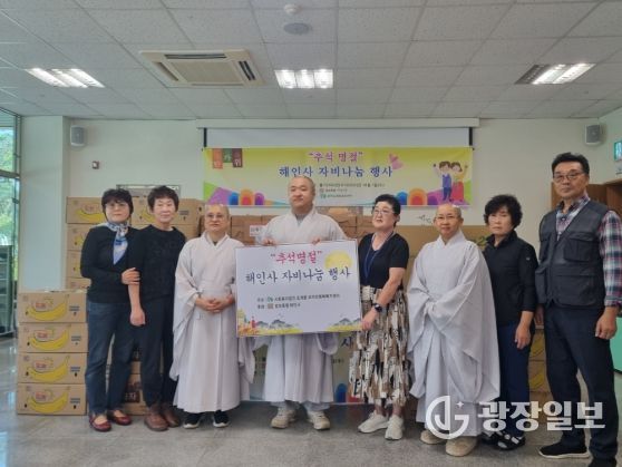 광장일보 주재영 기자 | 법보종찰 해인사와 조계종 사회복지재단 산하 코끼리행복복지센터는 10월 1일 봉산면, 묘산면, 가야면, 야로면의 노인맞춤돌봄서비스 대상자 어르신 800가구에 송편과 과일을 담은 선물 상자를 전달하는 ‘추석맞이 행복나눔 행사’를 진행했다.