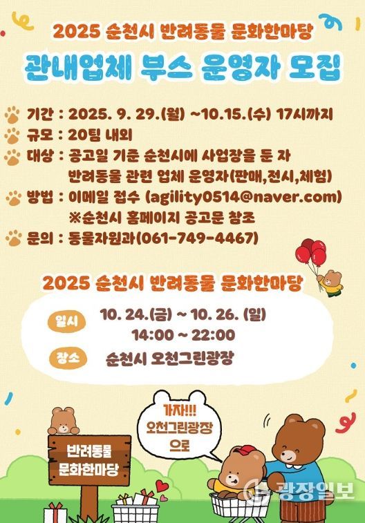 광장일보 주재영 기자 | 순천시가 오는 24일부터 26일까지 3일간 오천그린광장에서 열리는 반려동물 문화한마당의 성공개최를 위해 관내 업체가 참여하는 부스 운영자를 공개 모집한다.