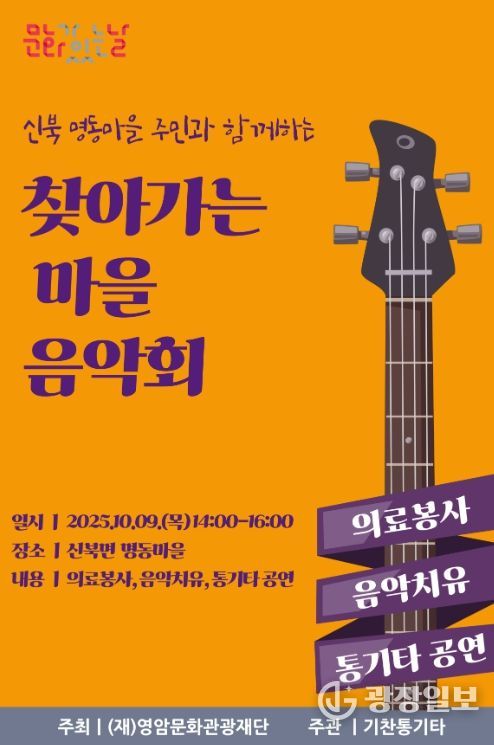 광장일보 주재영 기자 | (재)영암문화관광재단은 2025 문화가 있는 날 행사지원 사업으로 생활문화 동호회인 기찬통기타(대표:최문일)와 함께 신북 명동마을 주민을 대상으로 한 ‘찾아가는 마을 음악회’를 오는 10월 9일 한글날에 개최한다고 밝혔다.