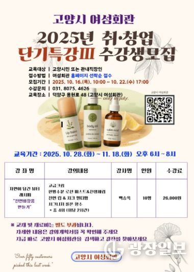 광장일보 주재영 기자 | 고양특례시 여성회관에서는 친환경과 건강을 중시하는 최신 트렌드를 반영한‘취창업 단기특강Ⅲ’수강생을 모집한다.