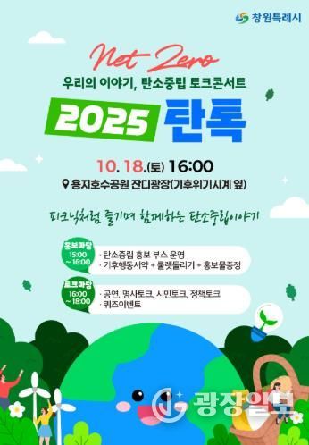 광장일보 주재영 기자 | 창원특례시는 오는 10월 18일 오후 4시 용지호수공원 탄소제로하우스 앞 잔디광장에서 기후위기 대응과 탄소중립 실천 문화를 확산하기 위해 탄소중립 토크콘서트 ‘2025탄톡’을 개최한다.