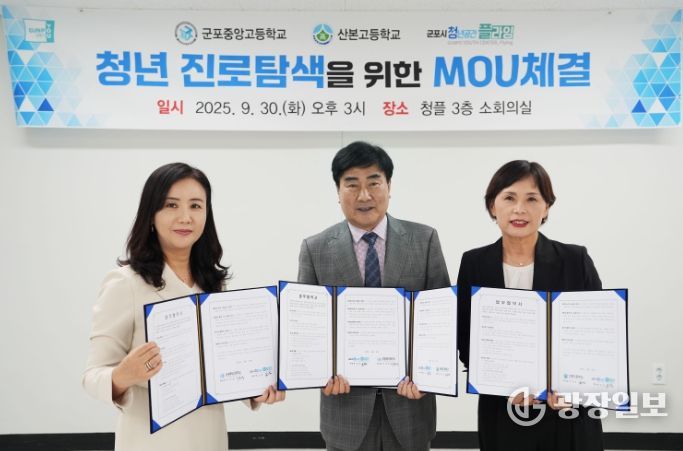 광장일보 주재영 기자 | 군포시 청년공간플라잉(센터장 조남)은 지난 9월 30일 군포중앙고(교장 이은경), 산본고(교장 김은정)와 함께 2025 창업스쿨 사업 관련 업무협약을 맺었다.