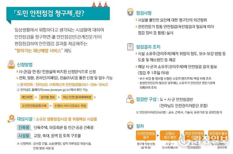 광장일보 주재영 기자 | 전라남도는 각종 재난으로부터 도민의 생명과 재산을 보호하고 일상 생활주변에 불안전한 위험요소를 찾아 무료로 안전점검하는 ‘도민 안전점검 청구제’를 운영하고 있다고 밝혔다.