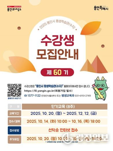 접수는 14일부터 16일까지 용인시 평생학습관 홈페이지에서 선착순으로 받는다.