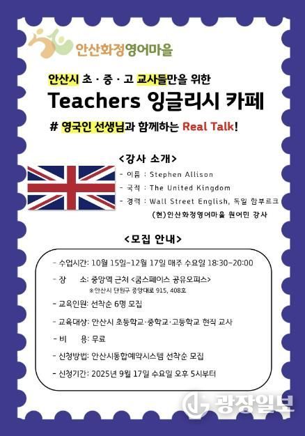 광장일보 주재영 기자 | 안산시 안산화정영어마을은 오는 15일부터 12월 17일까지 관내 소속 교사를 대상으로 ‘티처스(Teachers) 잉글리시 카페’를 운영한다고 10일 밝혔다.