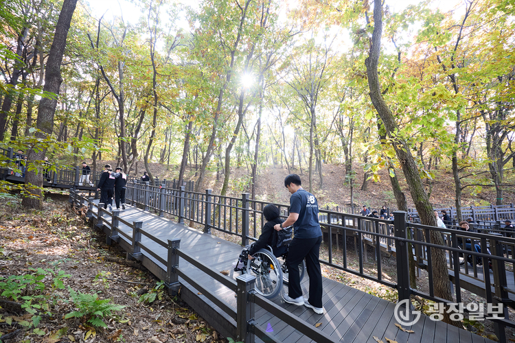양주시=주재영 기자ㅣ양주시가 토리근린공원에 무장애나눔길을 조성해 보행약자를 비롯한 시민 누구나 안전하게 숲을 체험할 수 있는 녹색 인프라를 마련했다. 완연한 가을 청취 속에서 시민들이 편안히 걸으며 자연의 아름다움을 느끼고 있다.