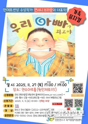 광장일보 주재영 기자 | 연수구육아종합지원센터(센터장 최종미)는 오는 27일 구청 연수아트홀에서 지역 내 영유아와 양육자를 대상으로 ‘행복한 문화 나들이’ 사업으로 가족 뮤지컬 ‘우리 아빠가 최고야’을 개최한다.