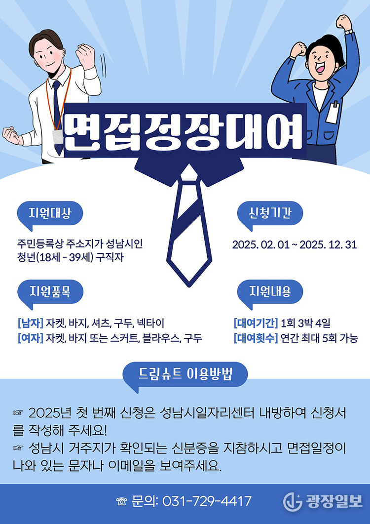 한편, 올해 10월 말 기준 면접정장 대여사업은 이용자 950여 명, 누적 대여 1,400여 건을 기록하며 높은 호응을 얻고 있다. 자세한 안내는 성남시일자리센터(☎031-729-4417) 또는 홈페이지(job.seongnam.go.kr)에서 확인할 수 있다.