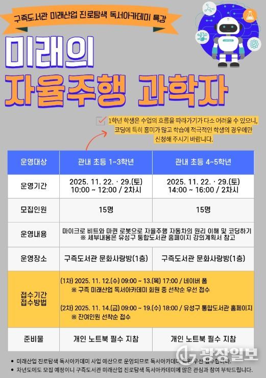 광장일보 이현나 기자 | 대전 유성구 오는 22일과 29일 구즉도서관에서 관내 초등학생을 대상으로 ‘미래의 자율주행 과학자’ 과학 특강을 운영한다.
