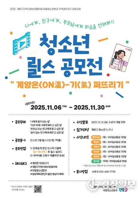 광장일보 주재영 기자 | 인천 계양구지역사회보장협의체 아동청소년분과는 청소년의 정신적·정서적 건강 증진과 건강한 또래문화 형성을 위해 ‘계양 온(ON溫)-기(氣) 퍼뜨리기’ 청소년 릴스 공모전을 개최한다고 밝혔다.