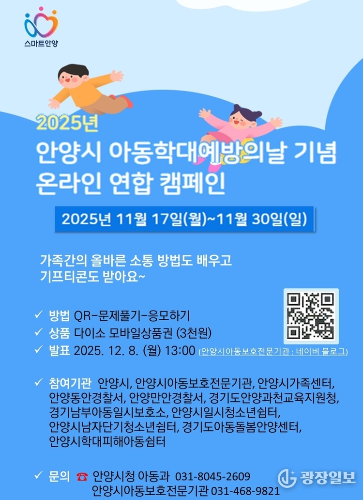 최대호 안양시장은 “우리의 관심이 아이들의 행복을 지킬 수 있다”며 “이번 온라인 캠페인을 통해 더 많은 시민이 아동학대 예방과 신고에 동참하는 계기가 되길 기대한다”고 밝혔다.