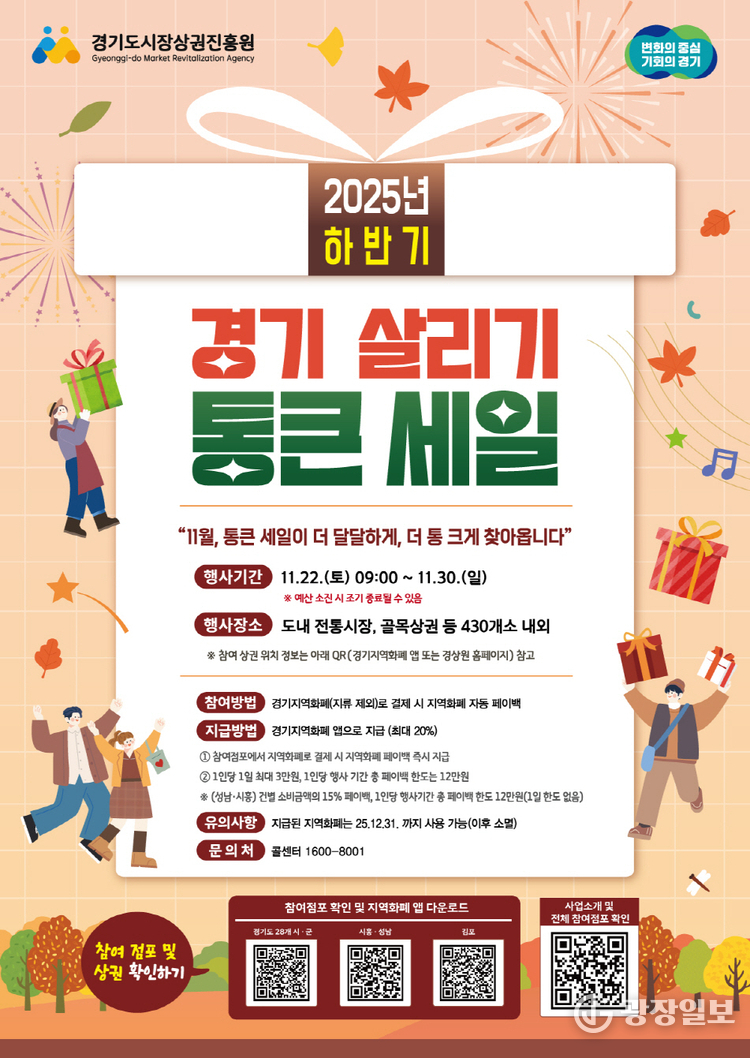 한편, 이번 세일은 예산 소진 시 조기 종료될 수 있으며, 참여 상권 정보 등 자세한 내용은 경기지역화폐 앱 또는 경기도시장상권진흥원 홈페이지에서 확인할 수 있다.