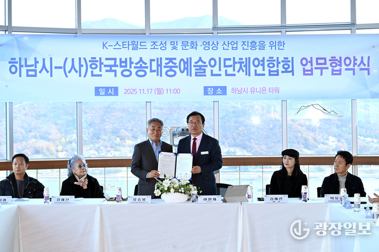 하남시= 주재영 기자 |하남시(시장 이현재)가 17일 하남 유니온타워에서 한국방송대중예술인단체연합회와 ‘K-컬처 복합 콤플렉스(K-스타월드)’ 조성을 위한 업무협약을 체결했다.