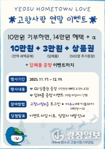 광장일보 주재영 기자 | 여수시는 연말정산 시즌을 맞아 고향사랑기부 참여자에게 더 많은 혜택을 제공하기 위해 ‘고향사랑기부제 연말 이벤트’를 진행한다.