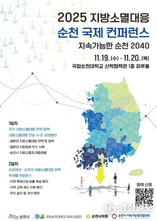 순천시는 오는 19일과 20일 양일간 국립순천대학교 산학협력관 파루홀에서 '2025 지방소멸대응 순천 국제 컨퍼런스'를 개최한다.