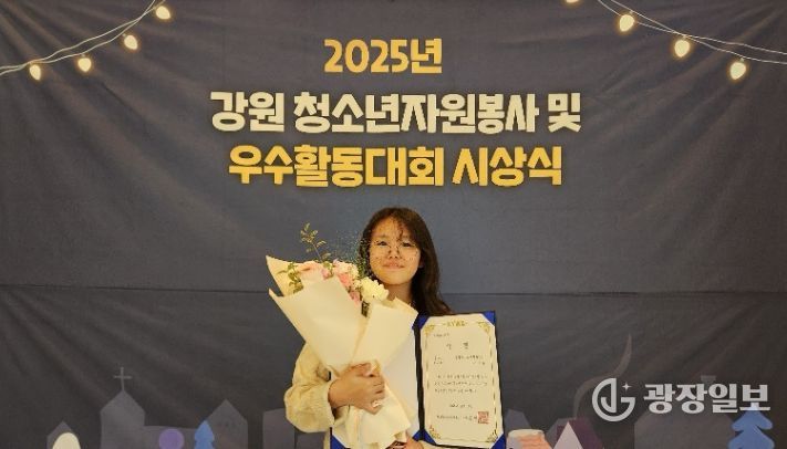 광장일보 이현나 기자 | 영월군청소년문화의집봉사동아리 소속 이가윤(무릉초6)이 지난 14일 ‘2025년 강원 청소년자원봉사 및 우수활동대회’ 시상식에서 한국청소년활동진흥원 이사장상을 받았다.