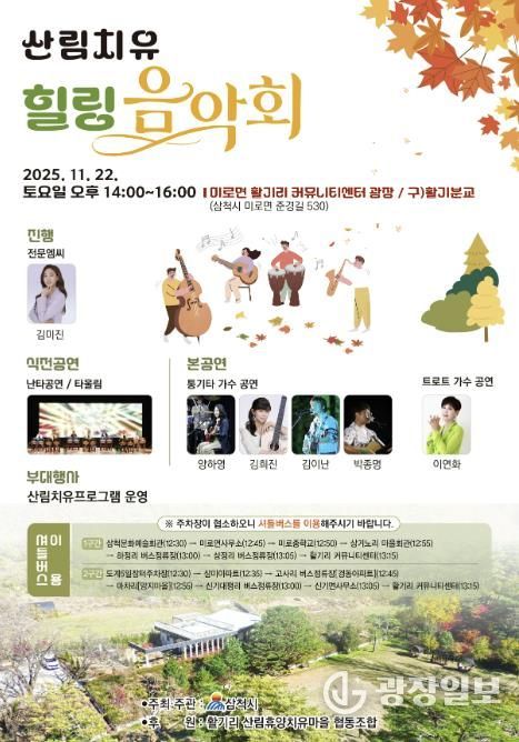 광장일보 이현나 기자 | 삼척시는 11월 22일 토요일 오후 2시부터 삼척활기 커뮤니티센터(미로면 준경길 530) 잔디광장에서 ‘산림치유 힐링 음악회’를 연다.