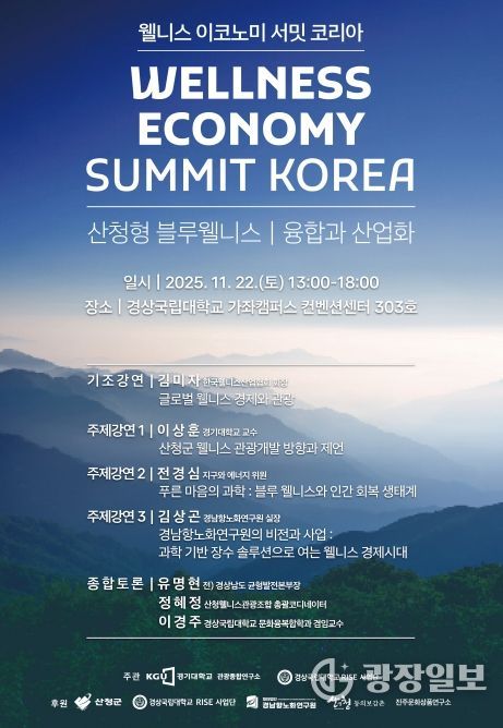 광장일보 주재영 기자 | 경상국립대학교 RISE 사업단(지역연계·산청군 과제)과 경기대학교 관광종합연구소는 산청군의 웰니스 관광 발전을 위한 업무협약(MOU)을 체결하고, 그 후속 성과를 공유하고 실행 과제를 구체화할 ‘웰니스 이코노미 서밋 코리아(Wellness Economy Summit Korea)’를 11월 22일 오후 1시 가좌캠퍼스 GNU컨벤션센터 303호에서 연다.
