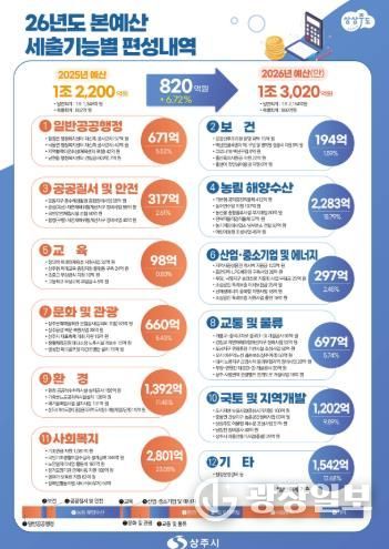 올해 상주시 예산안은 2025년 본예산(1조 2,200억 원) 보다 820억 원(6.72%) 증가한 1조 3,020억 원이다.