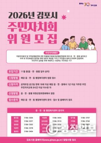 이번 모집은 주민자치회의 자율적 기반을 강화하고 자치역량을 높이기 위해 개정된 '김포시 주민자치회 및 주민자치센터 설치·운영에 관한 조례'에 근거해 추진된다. 김포시는 이번 조례 개정을 통해 주민자치회의 자율성과 전문성 강화를 통한 실질적 주민자치 실현의 기반을 마련했다.