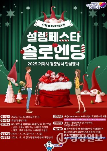 거제시는 “연말 감성을 담아 청년들이 부담 없이 교류할 수 있는 자리가 되도록 세밀하게 준비 중”이라며, “이번 행사가 새로운 인연을 찾는 기회가 되고, 지역사회에도 긍정적인 활기를 더하길 바란다”고 말했다.