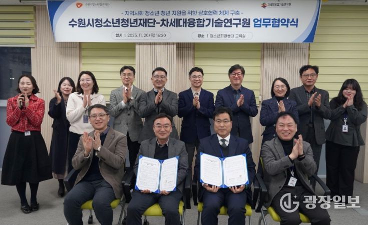 광장일보 나학천 기자 | 수원시청소년청년재단(이사장 최종진)과 차세대융합기술연구원(원장 김연상)은 11월 20일, 청소년·청년의 미래 역량 강화와 성장 지원을 위한 업무협약(MOU)을 체결했다.