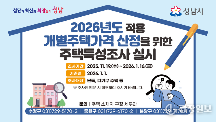 성남시= 주재영 기자 | 성남시(시장 신상진)는 2026년 1월 1일 기준 개별주택가격 산정을 위해 내년 1월 16일까지 단독·다가구·상가주택을 대상으로 주택특성조사를 실시한다고 밝혔다.