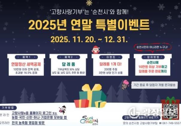광장일보 주재영 기자 | 순천시가 연말을 맞아 고향사랑기부제 활성화와 연말정산 혜택을 위해 11월 20일부터 12월 31일까지 ‘고향사랑기부제 연말 특별이벤트’를 실시한다고 밝혔다.