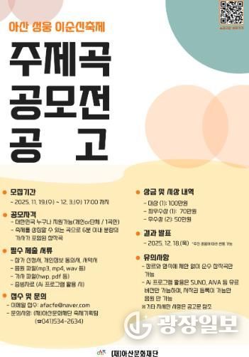 광장일보 주재영 기자 | (재)아산문화재단은 '아산 성웅 이순신축제'의 주제곡 공모전을 개최한다고 밝혔다.