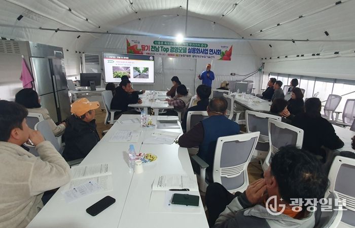 함평군은 지난 19일 전남농업기술원과 함께 대동면 ‘나비랑 딸기랑’ 김영각 농장에서 ‘전남 딸기 TOP 경영모델 실용화 사업 연시회’를 개최했다고 23일 밝혔다. 연시회는 함평군농업기술센터가 주관하고 전남농업기술원이 주최했다.
