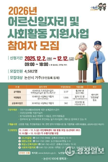 광장일보 주재영 기자 | 논산시는 2026년도 어르신일자리 및 사회활동 지원사업 참여자를 오는 12월 2일부터 12일까지 모집한다고 밝혔다.