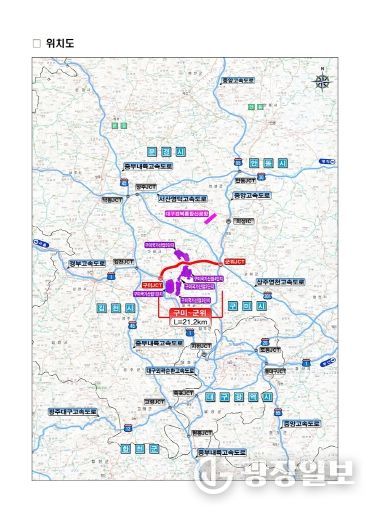 구미~군위 고속도로는 구미에서 군위군 효령면(중앙고속도로)까지 총 21.2km 구간을 4차로로 신설하는 사업으로, 사업비는 약 1조 5,627억 원 규모다. 이는 1970년 경부고속도로 이후 55년 만에 구미를 통과하여 동서를 잇는 첫 고속도로라는 점에서 의미가 크다.
