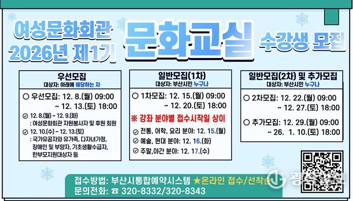 광장일보 주재영 기자 | 부산시 여성문화회관은 오는 내일(8일)부터 '2026년 제1기 문화교실' 수강생을 모집한다고 밝혔다.