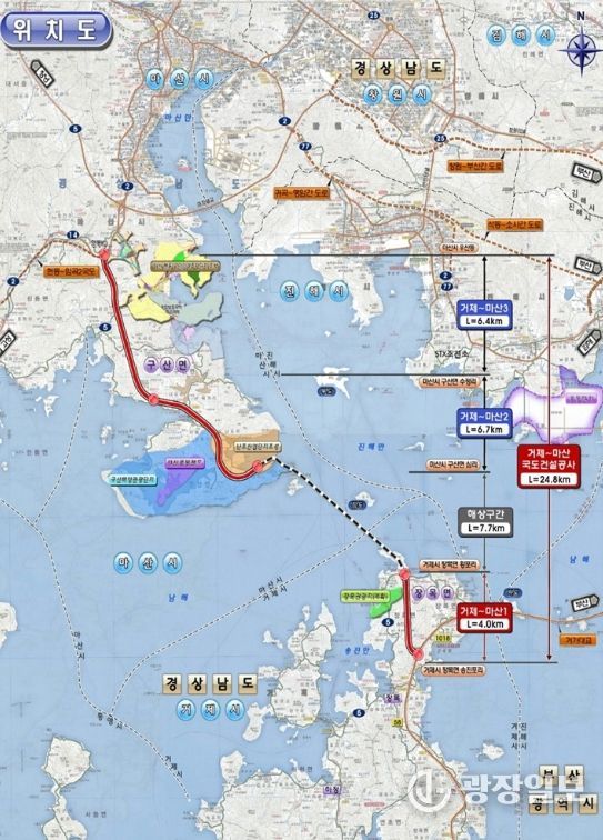 거제~마산 국도 5호선은 총 연장 24.8km(4차로 신설)로 창원시 마산합포구 현동에서 구산면 심리 구간 13.1km는 지난 2020년 이미 개통됐다.