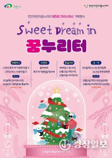 광장일보 주재영 기자 | 천안어린이꿈누리터(관장 조삼혁)는 오는 12월 25일부터 28일까지 제5회 크리스마스 기획행사‘Sweet Dream in 꿈누리터’를 진행한다고 밝혔다.