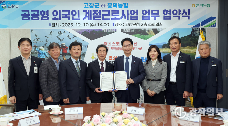 고창군= 주재영 기자 | 고창군과 흥덕농협이 지난 10일 2027년 공공형 계절근로사업 추진을 위한 업무협약을 체결했다. 이번 협약은 근로자 유치 국가 확정, 숙소 확보, 예산 편성 등 핵심 절차를 조기에 준비해 2027년 2월부터 사업을 안정적으로 운영하기 위한 기반을 구축하는 데 목적이 있다.