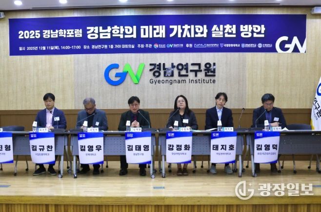 주제 발표 후에는 김태영 경남연구원 연구부원장을 좌장으로 ▲강정화 경상국립대학교 교수 ▲태지호 국립경국대학교 교수 ▲김영덕 전 한국콘텐츠진흥원 원장이 토론자로 참여해 경남학의 실천적 정책 방안에 대해 의견을 나눴다.
