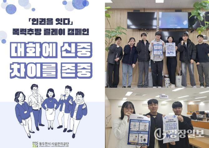 광장일보 주재영 기자 | 동두천시시설관리공단은 지난 11일 ‘인권을 잇다’ 폭력추방 릴레이 캠페인에 참여해 직장 내 괴롭힘·성희롱 예방과 인권존중 문화 확산을 위한 다양한 활동을 추진했다고 밝혔다.