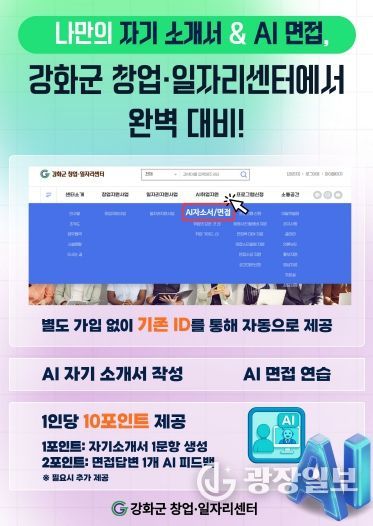 광장일보 주재영 기자 | 강화군 창업·일자리센터(센터장 오윤근)가 12월부터 AI 기술을 활용한 취업 지원 서비스 운영을 시작한다고 밝혔다.